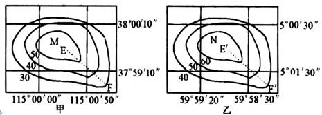 【小题1】图示跨经纬度看似一致,但由于乙图所在纬度低,故纬线较长,故判断乙图的实际范围更大,A错误,B正确。故同样EF处和E′F′处高差相同,但乙图的实际距离略大,故E′F′的坡度较EF小。