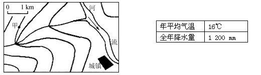 【小题1】河流流经河谷地区,所以河流两侧的等高线数值为200米,依次类推,从甲地到城镇要经过一个山脊部位,故看不到城镇景观A错误;甲地海拔为400米,城镇海拔范围为100-200米,所以两地高差为200-300米,故B错误;从全年降水量可见,该地降水丰富,河流为降水补给C正确;该地降水多,存在一陡崖部位,地势起伏大,易出现地质灾害D正确。
