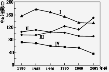小题1:Ⅳ能源只给率最低,为东部地区;Ⅰ地2000年以前,能源只给率最高,说明是主要的能源输出地区;判断为中部地区,2000年以前,东部的能源主要从中部调入;而2000年之后,随着西气东输、西电东送等工程的实施,西部地区的能源供应能力明显上升,故Ⅲ为西部地区。