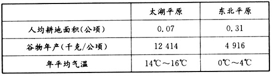 (2)沪宁杭工业区所在的长三角被称为"鱼米之乡",材料二中长三角太湖平原和东北平原的年平均气温存在很大差异,主要原因是_______________;两地主要的农业地域类型分别是________________和________________。太湖平原每公顷土地谷物年产远高于东北平原,最主要的原因是____________。