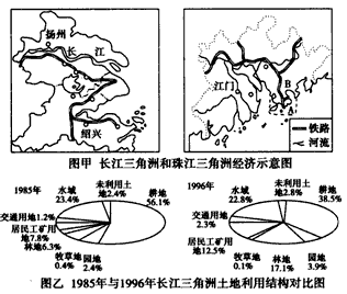 (5)图乙为1985年和1996年长江三角洲土地利用结构对比图,读后回答: