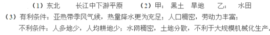 (1)根据图示的轮廓和河流水系图判断,甲表示我国东北地区,乙表示长江中下游平原。(2)东北地区黑土广布,由于地处北方,故耕地类型为旱地;我国长江中下游平原地处湿润地区,河网稠密,故耕地类型为水田。(3)比较两地的农业生产条件应从有利和不利两方面分析,影响农业生产的条件主要从气候、地形、土壤、水源和劳动力、农业基础等方面分析,主要与当地的地理实际相结合。