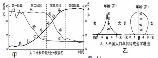 (1)从人口增长特征看,乙图中B国处于甲图中第?阶段,A国的人口出生率较?。 (2)分析B国面临的主要人口问题及解决措施。