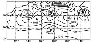小题2:图中各字母虽均处于气压中心,但处于低压中心的为Z、X、P、N,而Q、M均处于高压中心,图中各字母所处位置只有低压中心才有可能是阴雨天气。