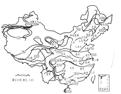 | 小题2:下列关于年平均总降水时数分布的不合理解释是 A.东部地区总降水时数分布的差异与锋面雨带的进退有关 B.云贵高原北部总降水时数与昆明准静止锋的影响有关 C.乌鲁木齐附近总降水时数线密集与地形及西风带的影响有关 D.东南沿海年平均总降水时数与暖流的关系最为密切