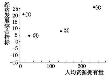 A.原料对区位的影响逐渐减弱 B.劳动力对区位的影响逐渐减弱 C.交通运输对区位的影响显著 D.市场是现代钢铁工业区位的决定因素 4、单选题 如图中的数字序号分别代表美国、日本、巴西和印度四国。读图,完成小题。 |