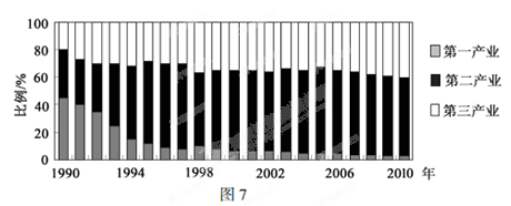 3、单选题 我国东南沿海某市原为农产品和部分轻工业原料生产基地,1990 年开始积极吸引外资,调整产业结构,建立起以化工、机械、纺织、电子、服装等为主的工业体系。下图是该市1990 ~2010 年产业结构变化图。读图回答问题。