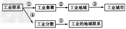 1.下列能反映图中①的事例有 [?] A.有色金属冶炼工业,往往会在大型水电站或火电站附近集聚 B.运输量大的工业企业往往在高等院校附近集聚 C.产品复杂、零部件种类繁多的复杂产品生产与各零部件生产之间的集聚 D.体积小、重量轻、价格贵的电子元件生产企业与电子产品组装厂之间的集聚 2.关于图中②③④⑤的说法正确的是 [?] A.工业集聚形成工业地域的过程②只能自发形成,不能规划建设 B.一些工业地域因内部联系简单,通过过程③,常会形成重要的工业城市 C.-些相互联系的工厂通过过程④发挥不同地方区位优势,可形成工业分散现象 D.通过现代化的交通运输方式,促进了过程⑤,形成了工业重镇