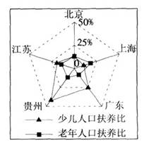 本题解析:直接读图可知,贵州的少儿人口抚养比最大,接近50%,A项正确;上海的老年人口抚养比最大;北京市的少儿人口抚养比小于广东,C错误;江苏省的少儿人口抚养比大于北京。