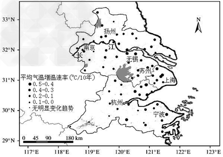 3、单选题 读“1961-2006长江三角洲平均气温增温速率空间分布图”,回答第1-2题