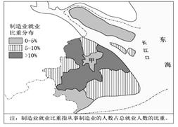 2、综合题 20世纪90年代以来,上海一方面争取了国产大飞机总装等项目,另一方面向安徽等地转出部分制造业。同时,城市内部空间结构优化,制造业集中分布区不断调整。下图表示上海市2004年制造业就业比重的空间分布。结合材料,回答问题(20分)