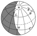 (2)图中,甲、乙两地均位于晨昏线中的________线上,乙地日落时刻是________时,昼长为 小时。