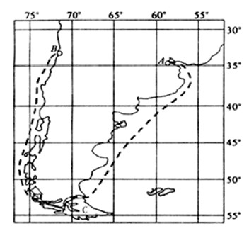 2.根据图示的虚线经过了C岛屿火地岛与南美大陆之间的麦哲伦海峡。