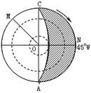 4、综合题 读南极为中心的投影图,下图中最外圈为赤道,虚线表示回归线与极圈,AB代表晨线,OM、ON为日期分界线,∠MOC=450,回答下列问题。(9分)