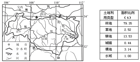 1、综合题 (10分)丹江口水库集水区为南水北调中线水源区。据《中国环境发展报告(2012)》,2010年丹江口水库水质评价为中营养状态,富营养化是丹江口水库水质的主要威胁。下图为南水北调中线水源区示意图,下表为水源区土地利用类型的面积比例表。读图表完成下列问题。