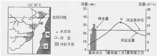 5、单选题 图甲所示的是一个为森林覆盖的河盆在暴雨中呈现的河流流量曲线及含沙量曲线。据此回答下题。