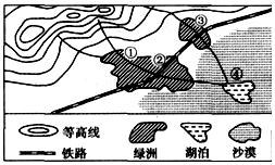 小题1:本题考查城市区位因素。影响城市的区位因素有自然因素和社会经济因素。其中自然因素包括河流、地形、气候等;社会经济因素包括资源、交通、政策等。②地位于河流和铁路交汇处,交通便利,水源充足,具有大片的绿洲,农业基础好。所以本题选择B选项。