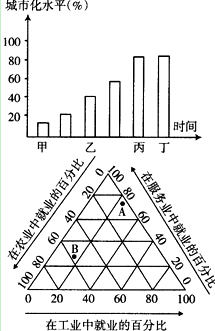 小题2:本题考查地理图表的判读能力。三角坐标的阅读需要找准坐标轴,然后找到平移轴。甲时期第一产业的就业人口比重高,为B;A时期在服务业中的就业比重高,为丙丁时期。所以本题选择A选项。