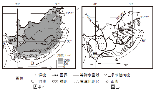 5、单选题 南非地理位置独特,国土面积约为122万平方千米。农业较为发达,但受自然地理因素影响明显,耕地的分布不平衡,农业生产地区差异大。图甲为南非地形地势图,图乙为南非耕地和降水量分布示意图。读图,回答下列各题。
