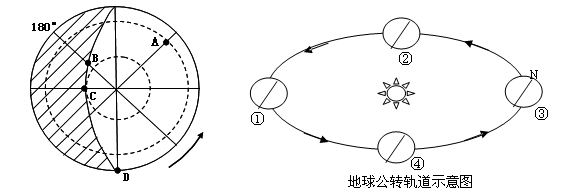 ⑷ 该日,地球位于地球公转轨道图中的 位置(填序号)。