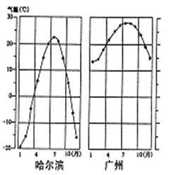 本题解析:本题考查我国的气候差异。(1)根据右图信息分析。哈尔滨1月均温约-20°C,广州1月均温约14°C。我国冬季气温的分布特征:南方温暖,北方寒冷,南北温差大。影响我国冬季气温分布的主要因素:纬度和冬季风。(2)哈尔滨7月均温约23°C,广州7月均温约28°C。说明我国夏季气温分布特征:南北普遍高温。原因是此时太阳直射北半球,南方地区正午太阳高度较北方大,但昼长较北方短,故温差小。