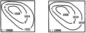 4、单选题 下图所示等压线图中,A、B、C、D各点风力最大的是( )