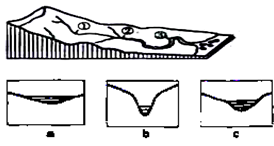 下游,随着流速的变化,上游河段流水侵蚀严重,则河谷深,而河流中游以搬运作用明显;下游河段流水的沉积明显,河床最平坦。故①—b—流水侵蚀;②—c—流水搬运;③—a—流水沉积。故选B项。