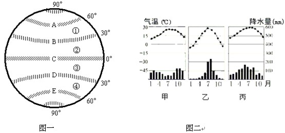 【小题1】在图一中相应位置画出南北半球的信风带和西风带的风向。