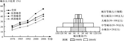 2、综合题  (10分)经济发展推动了我国的城市化进程,下面左图是我国改革开放以来全国及三大经济地带城市化水平的变化情况,右图是我国1980年和2004年城市等级规模金字塔示意图,读图回答下列问题。