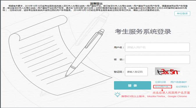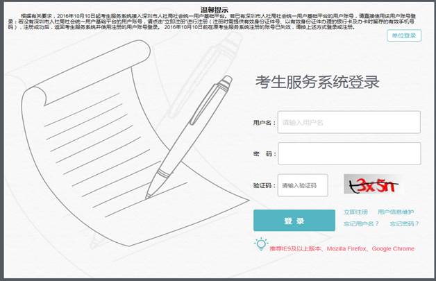 为防范冒用他人身份恶意注册、使用虚假身份信息报考等情况发生,考生服务系统已接入深圳市人力资源和社会保障局社会统一用户基础平台(以下简称统一用户平台),通过联网银行信息核验平台对考生进行实名认证。报考人员须凭已注册的统一用户平台账号方可登录考生服务系统进行报名。如没有统一用户平台账号,请在考生服务系统登录页面点击“立即注册”,在跳转的链接页面进行注册(建议从即日起先进行注册,无需等到考试报名开始)。在接入统一用户平台前注册的考生服务系统账号已失效,不再使用,需要重新注册。具体注册操作见《深圳市人事考试考生服务系统注册指南》。