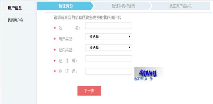 进入找回用户名页面后,根据页面上方的流程,填写所需信息: