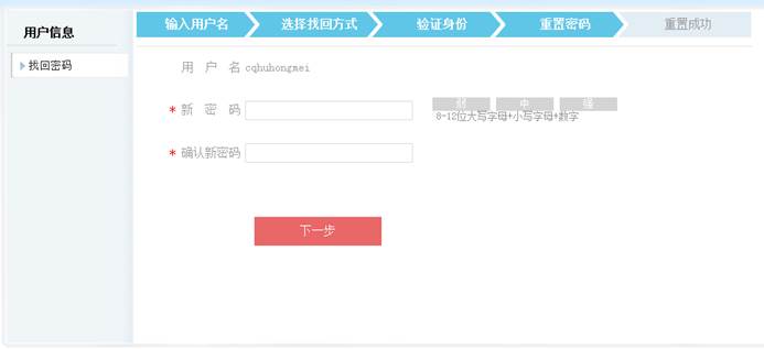 1.输入用户名:输入用户名和验证码,点“下一步”进入选择找回方式页面。