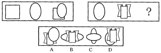 (答案为D。第一组的三幅图之间存在着明显的运算关系,第一幅图和第二幅图叠加得到第三幅图,而且可以注意到,第二幅图叠加在第一幅图的右上方。按此规律应当选择D项。)
