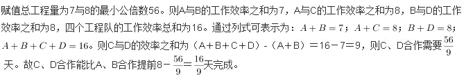 46、单选题 A、B、C、D四个工程队修建一条马路,A、B合作可用8天完成,A、C或B、D合作可用7天完成,问C、D合作能比A、B合作提前多少天完成:_____