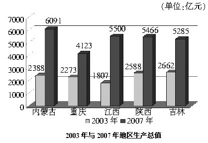 下图显示的是内蒙古、重庆、江西、陕西、吉林五个省(市)2003年与2007年地区生产总值,请根据图形回答以下的问题。