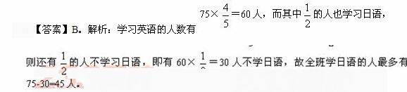 45.【解析】B。每3人发一个苹果,每5人发一个橘子,所以每15人中就有1人既拿到苹果又拿到橘子,有10个小朋友苹果和橘子都拿到,所以小朋友至少有15×(10-1)+1=136人。