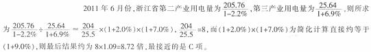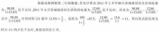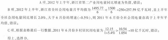 122、参考答案:B。2012年上半年,浙江省全行业用电量同比增长0.6%;三大产业的增速分别为8.7%,-0.8%,11.3%;只有第二产业增速低于0.6%,则第二产业用电量占全行业用电量的比重比上年同期下降,答案选B。