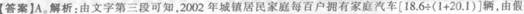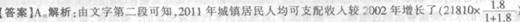 103 B【解析】由文字第三段可知,2002年农村居民恩格尔系数为40.49件5.8%=46.2%,城镇为36.3%+1,4%=37.7%.则所求为46.2%+37.7%≈46÷38=(38+8)+38 1.2倍。选B。