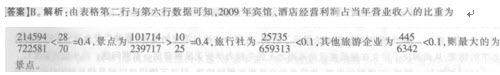 106 A【解析】A项,从表中可知,营业成本占营业收人最高的明显是旅行社,超过90%,A项正确。B项,从表中可知,景点的利润总额为23814万元,宾馆、酒店的利润总额为11040万元,11040×2=22080<23814万元,B项错误。 C项,从表中可知,其他旅游企业的投资收益超过宾馆、酒店.C项错误。D项,景点的年末职工人数不是最多的,则占比不可能超过一半,D项错误。综上,应选择A。