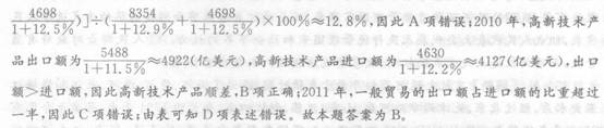 109.C【解析】2011年,一般贸易净出口额为9171-10075=-904(亿美元),机电产品净出口额为10856-7533=3323(亿美元),加工贸易净出口额为8354-4698=3656(亿美元),高新技术产品净出口额为5488-4630=858(亿美元),因此,一般贸易<机电产品,高新技术产品<加工贸易,高新技术产品<机电产品,一般贸易<加工贸易,因此C项错误。故本题答案为C。