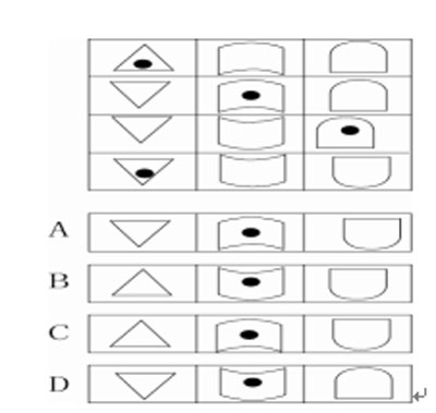 解析:从每一竖列的规律来看,都为统一的图形,只是上下方向不同,而且规律是每次遇到黑点后的下一个图形与黑点处图形的方向相反,因此,答案为B。
