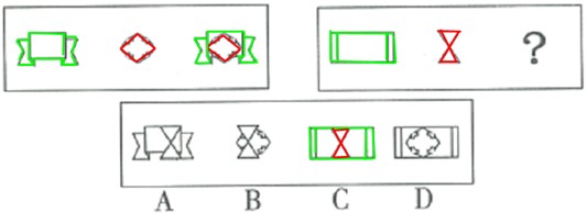 这道题属于结构类,主要考察图形的叠加,即前面的图形叠加组成后面的图形。本题解题方法可以采用排除法,先比较4个选项中的不同点,并由此与左边的4个图形进行比较,通过逐一排除的方式找到正确答案。仔细比较右边4个选项,不难发现,A图中间少1对平行线,B图中轴线左侧上面少1条短线,D图中轴线左侧下面多1条短线。因此,只有C图可以由左边的图形拼合而成。考查点:判断推理>图形推理>位置类>叠加