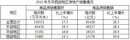 2013年,全国商品房销售面积130551万平方米,比上年增长17.3%,增速比1-11月份回落3.5个百分点,比2012年提高15.5个百分点;其中,住宅销售面积增长17.5%,办公楼销售面积增长27.9%,商业营业用房销售面积增长9.1%。商品房销售额81428亿元,增长26.3%,增速比1-11月份回落4.4个百分点,比2012年提高16.3个百分点;其中,住宅销售额增长26.6%,办公楼销售额增长35.1%,商业营业用房销售额增长18.3%。