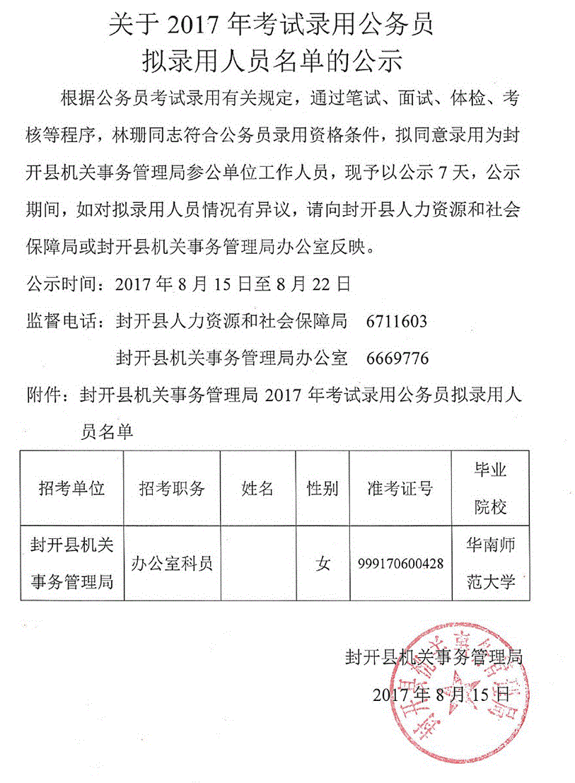根据公务员考试录用有关规定,通过笔试、面试、体检、考核等程序,林珊同志符合公务员录用资格条件,拟同意录用为封开县机关事务管理局参公单位工作人员,现予以公示7天。公示期间,如对拟录用人员情况有异议,请向封开县人力资源和社会保障局或封开县机关事务管理局办公室反映。