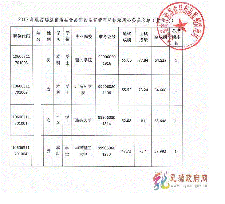 2017年乳源瑶族自治县食品药品监督管理局拟录用公务员名单(共4人)