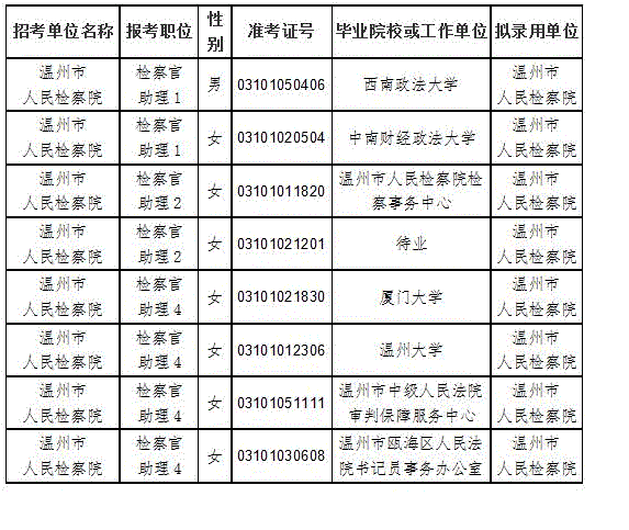 浙江:2016浙江温州市人民检察院公务员考试拟录公示