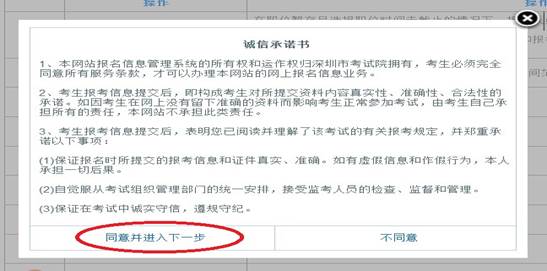 (三)认真阅读弹出的诚信承诺书,如同意则点击“同意并进入下一步”。如下图:
