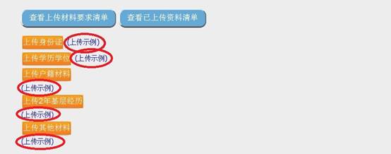 点击各项材料上传按钮后的“上传示例”可查看各项材料上传示例,示例仅展示了部分材料,考生在每个栏目中所需上传的材料应根据资格复审公告中的要求进行上传。如下图: