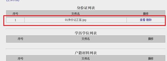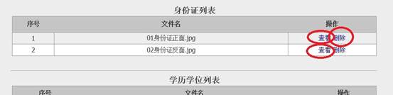 (六)查看和删除已上传的资格复审材料。可点击已上传材料旁的“查看”按钮可查看已上传的资格复审材料;点击已上传材料旁的“删除”按钮可删除已上传的资格复审材料。如下图: