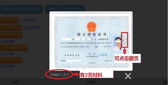 如果在一个栏目中上传了多个材料,可点击键盘上的“←” “→”健进行翻页查看,或点击图片旁的翻页按钮翻页查看多个材料,如下图:
